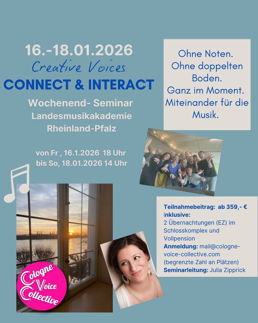 Für die Musik.Anmeldung per Email an mail (at) cologne-voice-collective.comIm gemeinsamen Musizieren (mind. 11 Unterrichtsstunden), im Austausch und Miteinander, in der Natur direkt am Rhein beschäftigen wir uns mit folgendem Inhalt: Wir üben, unsere erlernten musikalischen Fähigkeiten in einem freien, nicht durch Notenmaterial vorgegebenen Rahmen kreativ umsetzen zu lernen, mit den Mitteln Musik und Bewegung miteinander zu kommunizieren und etwas Gemeinsames, Einzigartiges zu erschaffen, das sowohl absolut authentisch als auch künstlerisch hochwertig ist.
