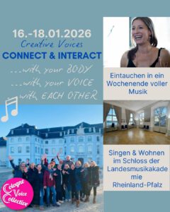 Anhand von verschiedene Formen /Übekonzepten /Aufgaben üben wir, eine Vocal Band zu formen, Duette zu singen, Bewegung und Stimme zu synchronisieren, wie ein Orchester zu klingen, Circle Songs zu leiten etc.