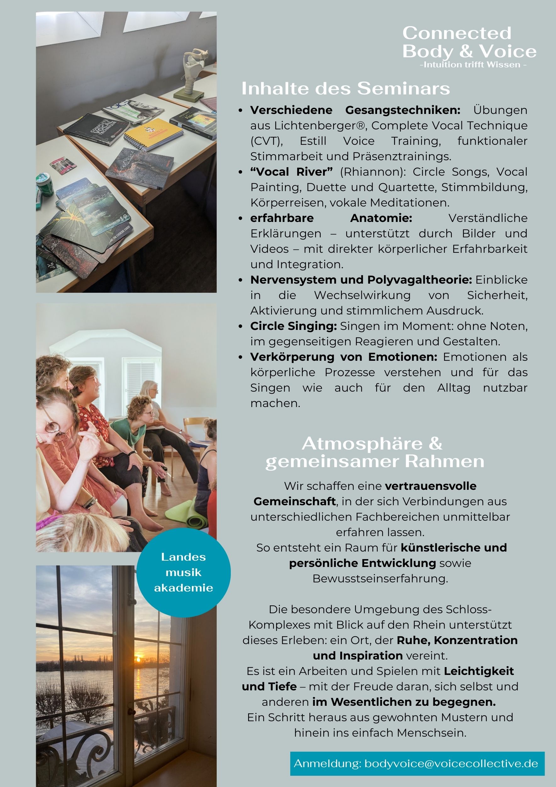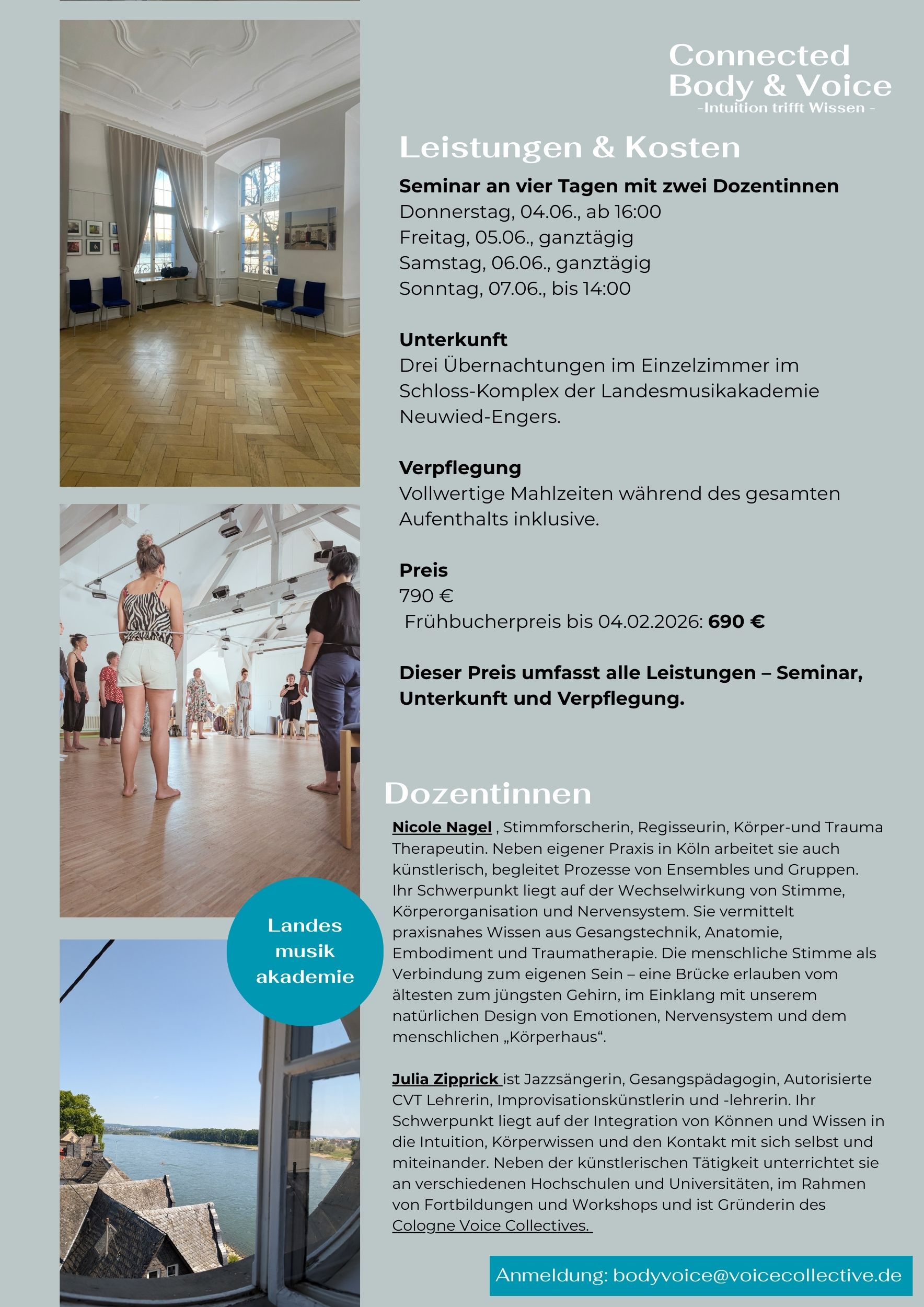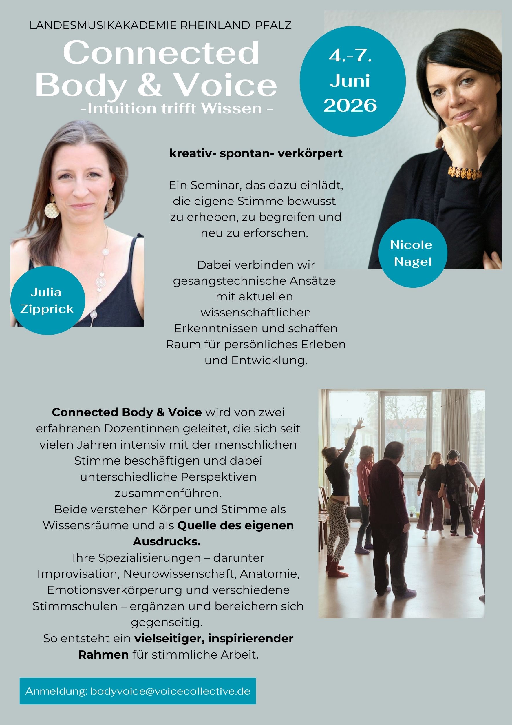 Agenda AlleAnstehend2011201220132014201520162017201820192020202120222023202420252026 Termin Informationen: Do.04Juni2026So.07Juni2026 Workshop / Connected Body & VoiceLandesmusikakademie NeuwiedNeuauflage 2026!!